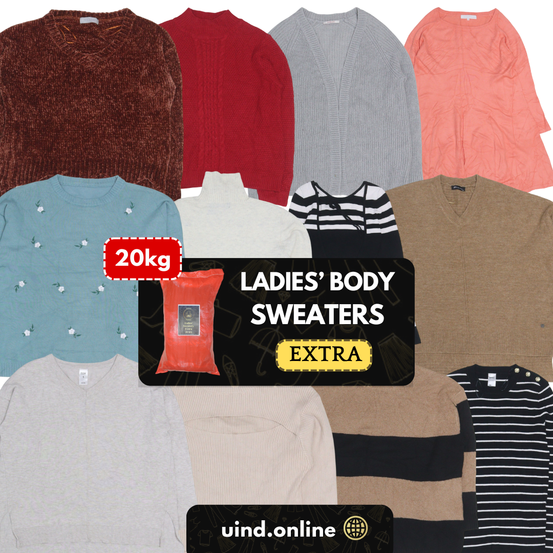This 20kg bag of Grade A Extra ladies’ body sweaters features a premium selection of stylish, form-fitting sweaters perfect for cool and winter seasons. Each piece is carefully chosen for excellent condition, trendy designs, and comfortable stretch fabrics. Expect a mix of high-quality knits, ribbed styles, turtlenecks, long sleeves, and elegant fits in a variety of colors and sizes.