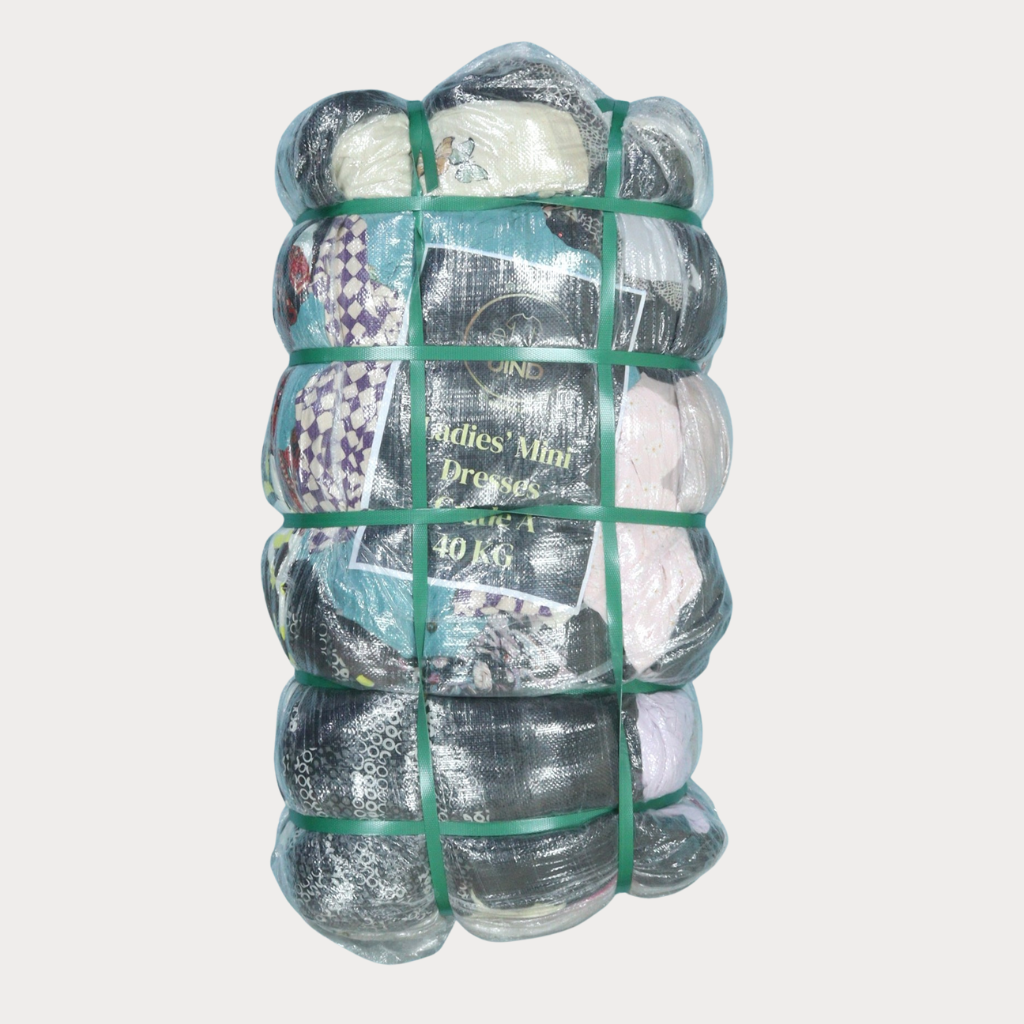 Our 40kg bale of Grade A ladies' mini dresses offers a curated selection of high-quality, fashionable garments. These mini dresses are perfect for various occasions, providing both style and comfort. The assortment includes a diverse range of colors, patterns, and sizes to cater to different customer preferences.