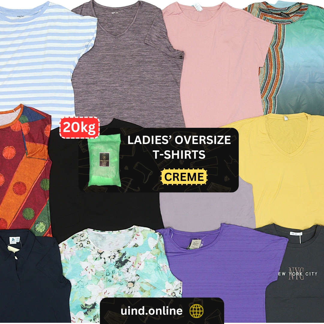 👚 Product Overview: Our 20kg bag of Crème Grade ladies' oversized T-shirts offers a premium selection of high-quality, fashionable tops. These oversized T-shirts are perfect for various occasions, providing both style and comfort. The assortment includes a diverse range of colors, patterns, and sizes to cater to different customer preferences.