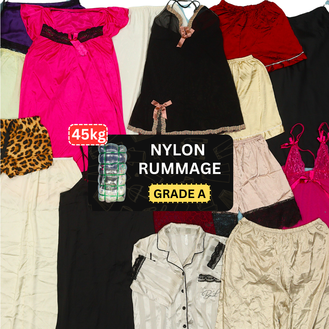🧵 Product Overview: Our 45kg bale of Grade A Nylon Rummage offers a diverse assortment of high-quality nylon clothing and accessories. This selection is ideal for various applications, including fashion, upholstery, and industrial uses. The bale includes a mix of colors, patterns, and textures, providing versatility for creative projects.